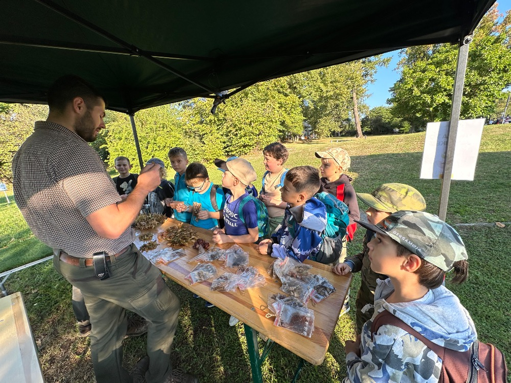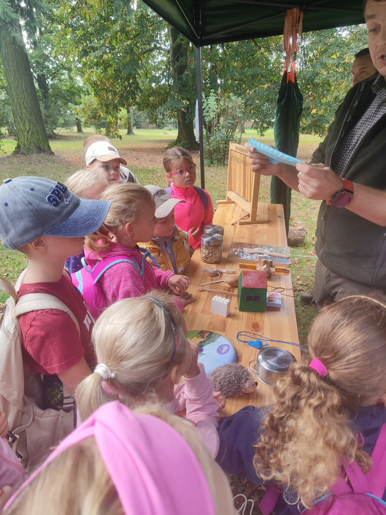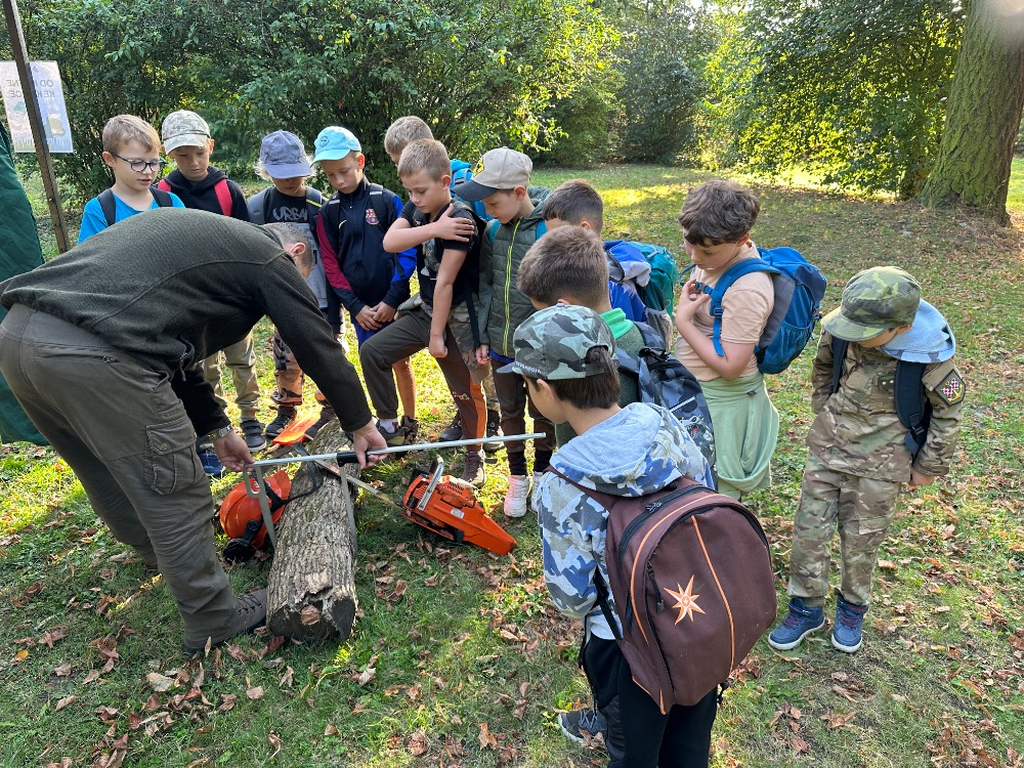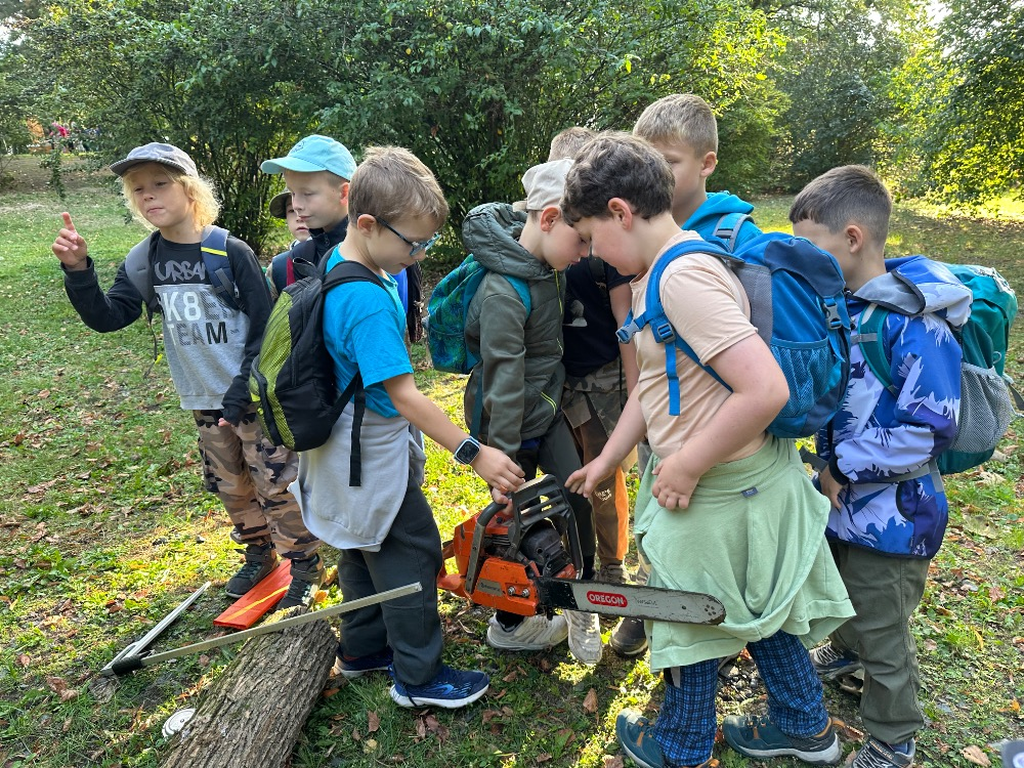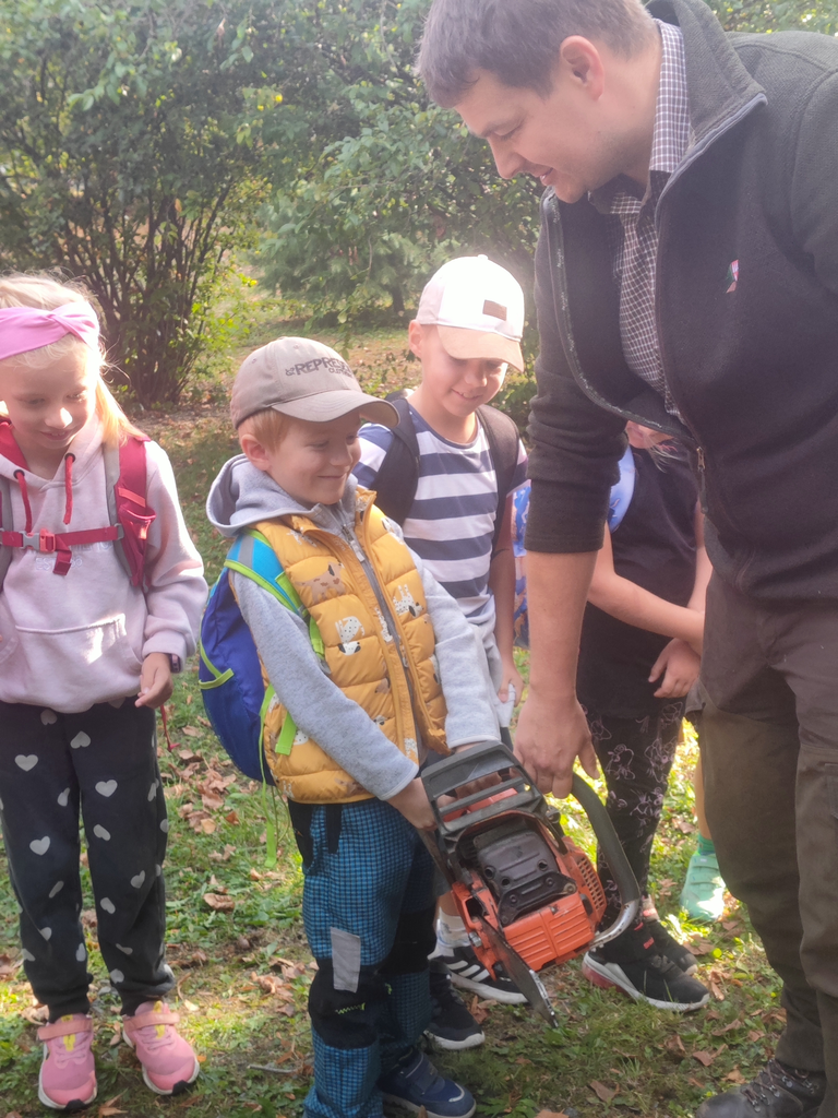 Pak přišel pan lesník se zvuky zvířat. A pozor – podařilo se nám přilákat dokonce straku! Na dalším stanovišti děti zkusily zvednout motorovou pilu (prý nic pro slabé ruce!) a naučily se rozpoznávat různé druhy dřeva.