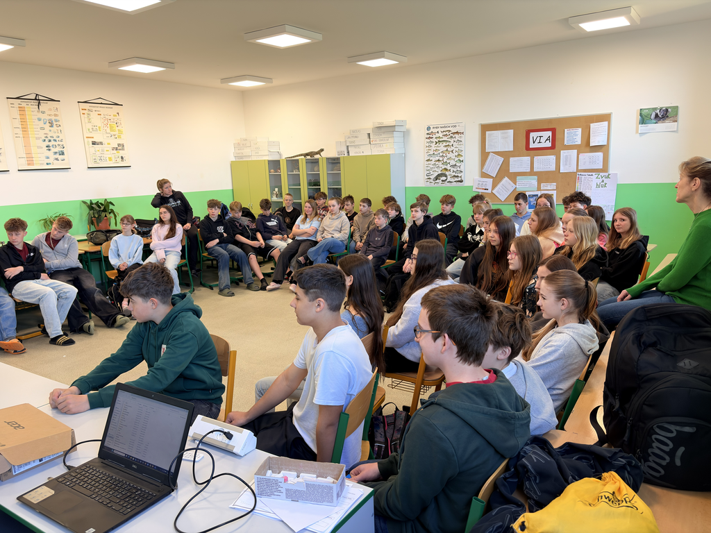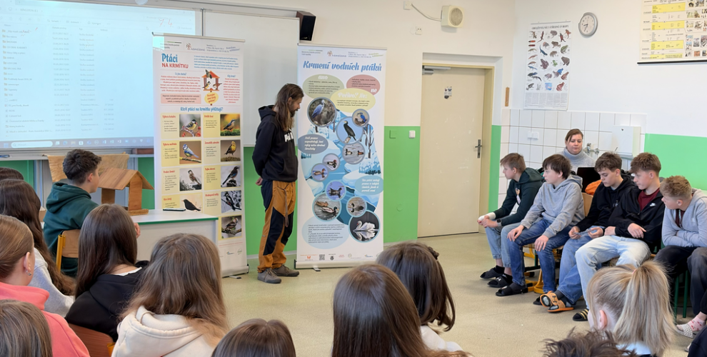 Dne 8. 4. 2026 měli žáci 7. ročníků jedinečnou příležitost přivítat na naší škole pana RNDr. Jiřího Křesinu z neziskové organizace Beleco, který si pro ně připravil zajímavou besedu o ptácích.