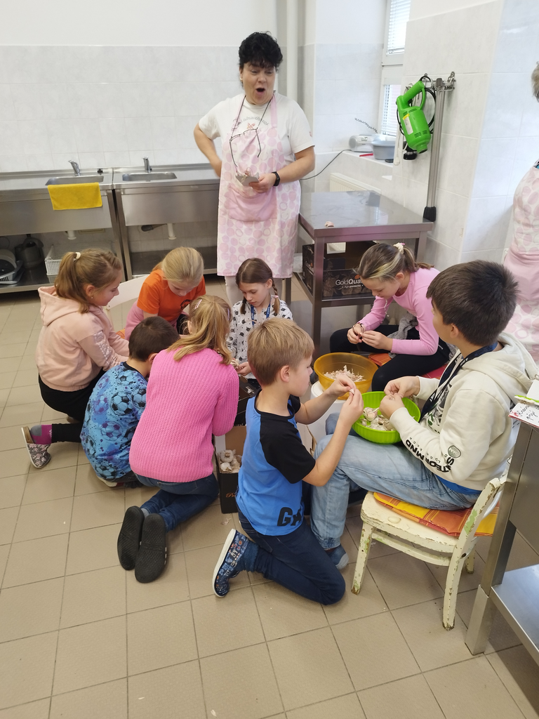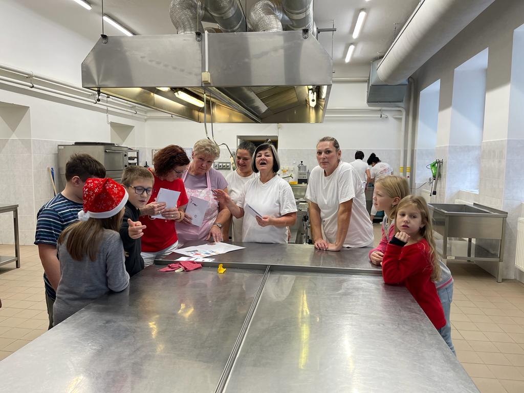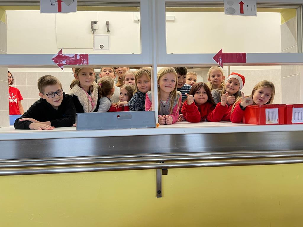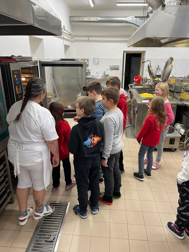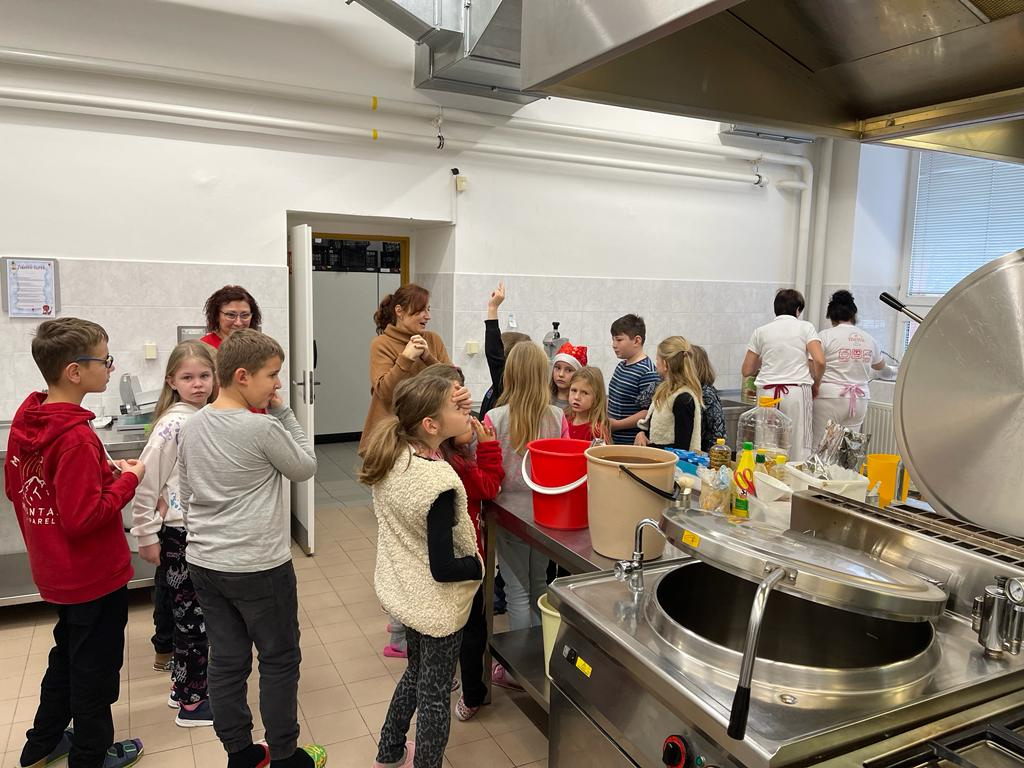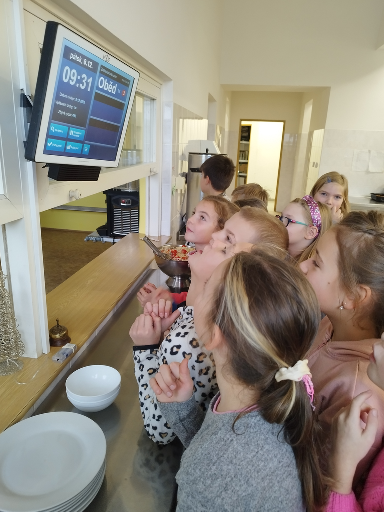 V předvánočním čase jsme se žáky třetích tříd navštívili paní kuchařky a prostory školní kuchyně. Zajímalo nás, co všechno je potřeba, když se chystají obědy pro celou školu. Protože víme, že jednoduché to určitě není, připravili jsme si pro paní kuchařky několik dárků a překvapení. Ony nás přivítaly velice mile a ukázaly nám všechna „kouzla“ příprav jídel pro žáky i učitele. Děti si zkusily vyčistit moderní pečící troubu pomocí hadice s vodou, zamíchat polévku ve velkém kotli, zjistit, jak se vozí jídlo výtahem, zjistit, kde se ve sklepě schovává oblíbená Nutella😊 či jak to vypadá z druhé strany výdejního okénka. Milým spontánním gestem ze strany dětí byla pomoc s loupáním česneku, při které zarecitovaly říkanku Posvícení od Jiřího Žáčka, která se do kuchyně určitě hodila😊. V samotném závěru návštěvy měly děti pro paní kuchařky připravené vánoční otázky, např. Co nejraději pečete na Vánoce? Jaký máte doma adventní věnec? Jaký byl váš nejhezčí dárek od Ježíška? Co připravujete ke štědrovečerní večeři? Toto milé povídání jsme uzavřeli předáním sladkého poděkování a vyrobených vánočních přáníček, se kterými dětem pomohly paní vychovatelky 3. tříd. Byla to moc příjemná zkušenost pro obě strany – děti i paní kuchařky😊.