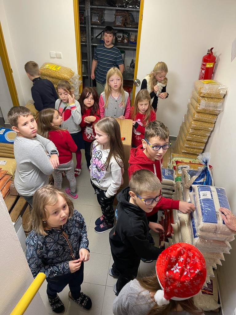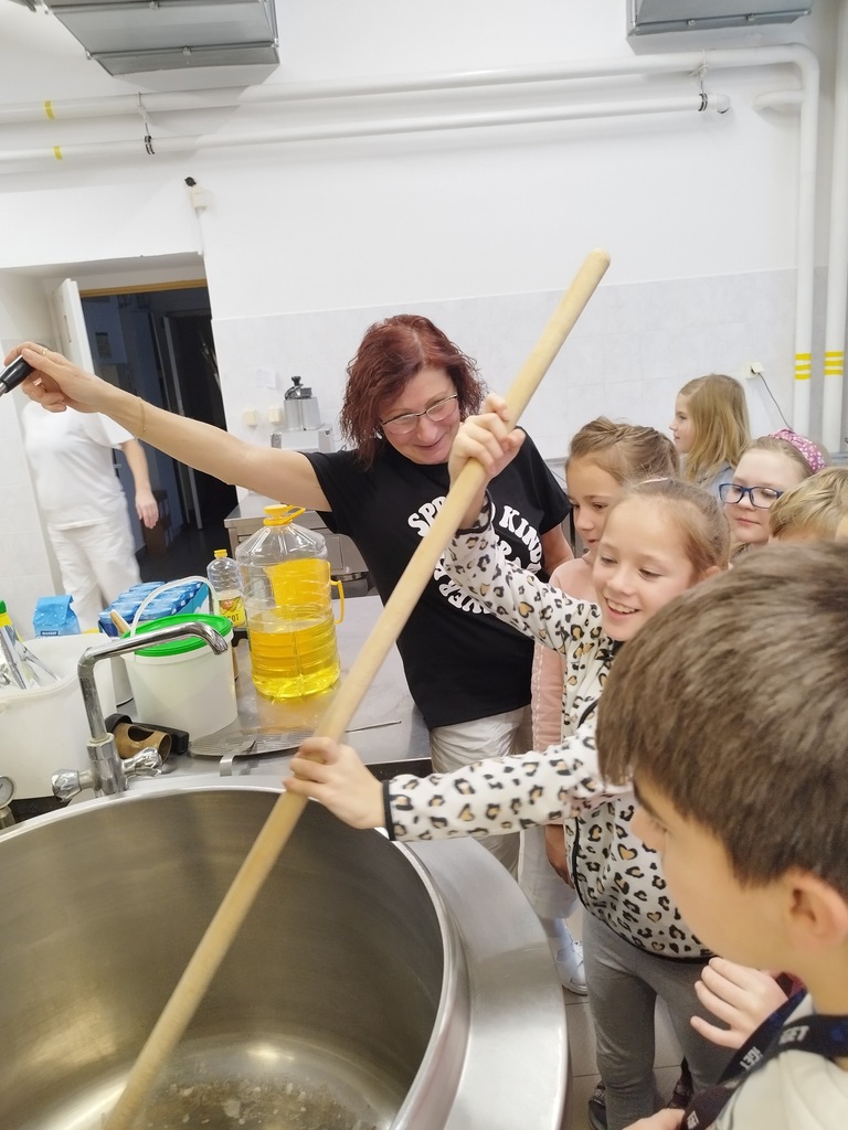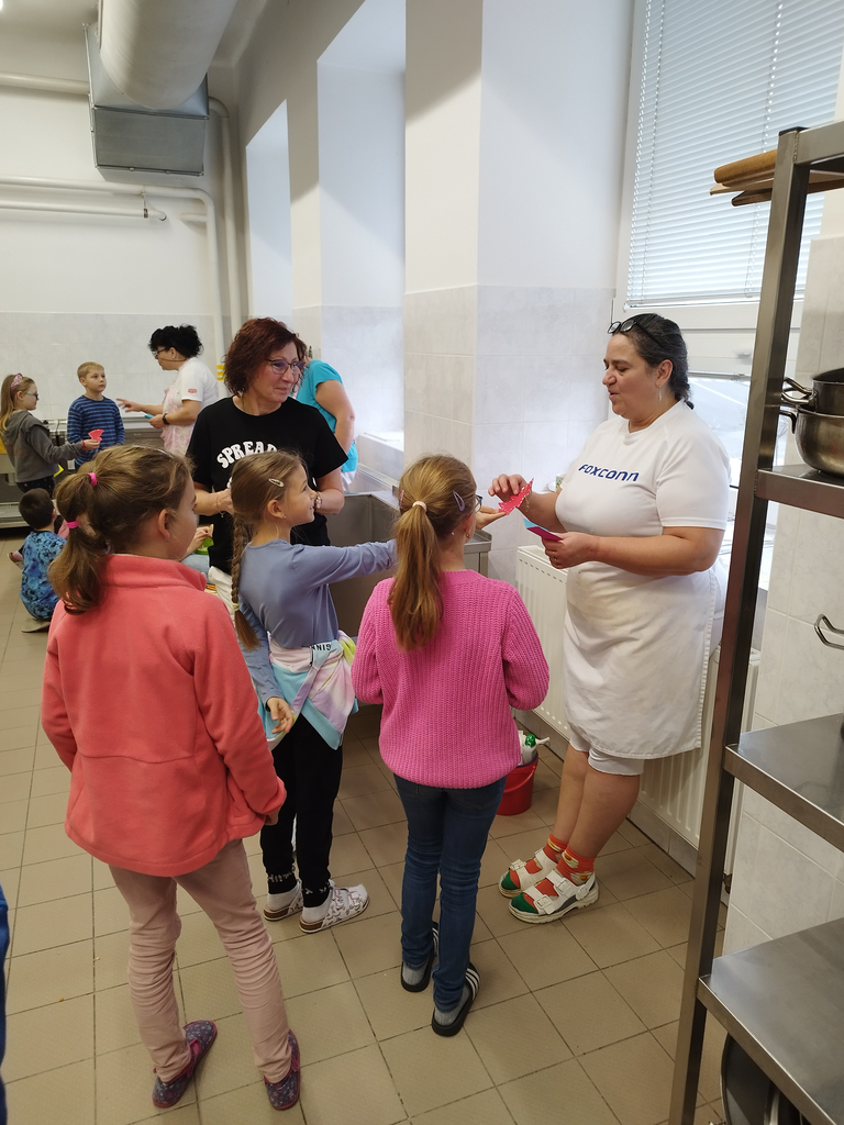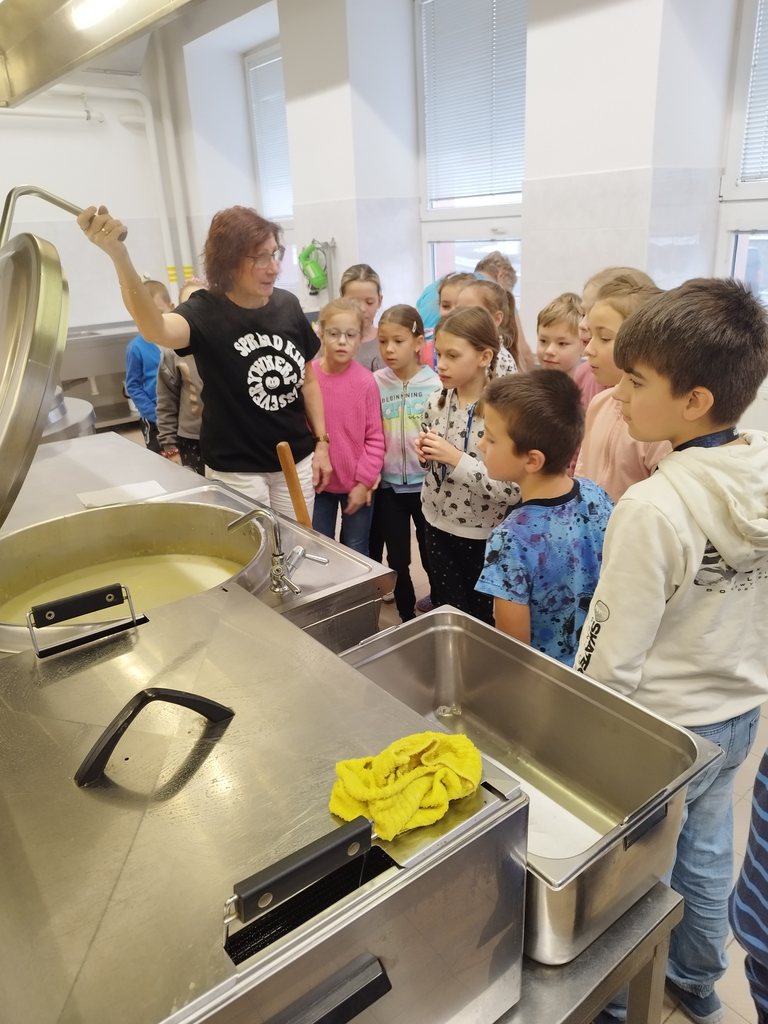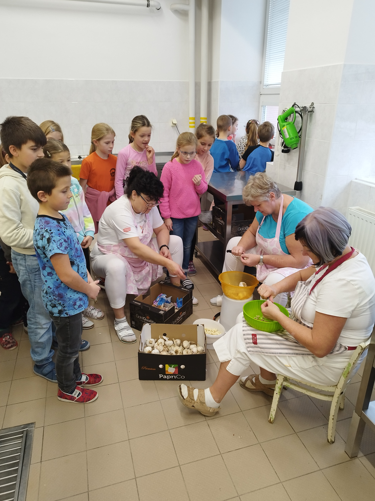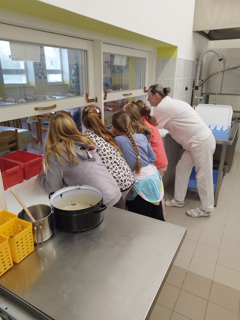 V předvánočním čase jsme se žáky třetích tříd navštívili paní kuchařky a prostory školní kuchyně. Zajímalo nás, co všechno je potřeba, když se chystají obědy pro celou školu. Protože víme, že jednoduché to určitě není, připravili jsme si pro paní kuchařky několik dárků a překvapení. Ony nás přivítaly velice mile a ukázaly nám všechna „kouzla“ příprav jídel pro žáky i učitele. Děti si zkusily vyčistit moderní pečící troubu pomocí hadice s vodou, zamíchat polévku ve velkém kotli, zjistit, jak se vozí jídlo výtahem, zjistit, kde se ve sklepě schovává oblíbená Nutella😊 či jak to vypadá z druhé strany výdejního okénka. Milým spontánním gestem ze strany dětí byla pomoc s loupáním česneku, při které zarecitovaly říkanku Posvícení od Jiřího Žáčka, která se do kuchyně určitě hodila😊. V samotném závěru návštěvy měly děti pro paní kuchařky připravené vánoční otázky, např. Co nejraději pečete na Vánoce? Jaký máte doma adventní věnec? Jaký byl váš nejhezčí dárek od Ježíška? Co připravujete ke štědrovečerní večeři? Toto milé povídání jsme uzavřeli předáním sladkého poděkování a vyrobených vánočních přáníček, se kterými dětem pomohly paní vychovatelky 3. tříd. Byla to moc příjemná zkušenost pro obě strany – děti i paní kuchařky😊.