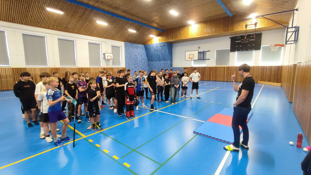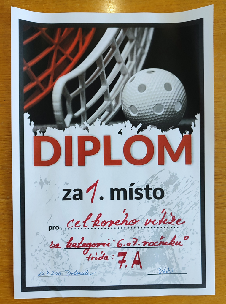 Dne 22.4. 2026 se na naší škole uskutečnil tradiční florbalový turnaj pro 6. a 7. ročníky. Žáci se nejdříve utkali v rámci svých ročníků vzájemnými zápasy a následně si zahráli i dle umístění napříč ročníky. V kategorii 6. ročníků zvítězila třída 6.C a v kategorii 7. ročníků a celkovým vítězem turnaje se stala třída 7.A.