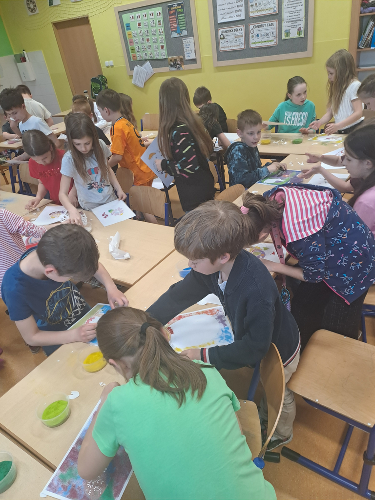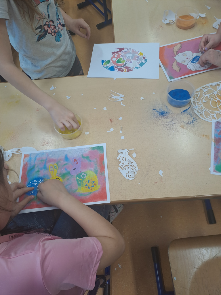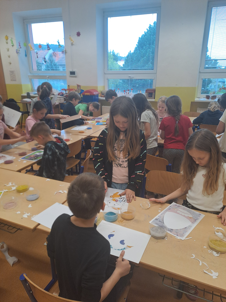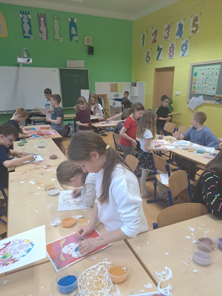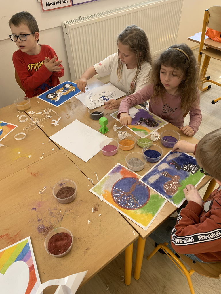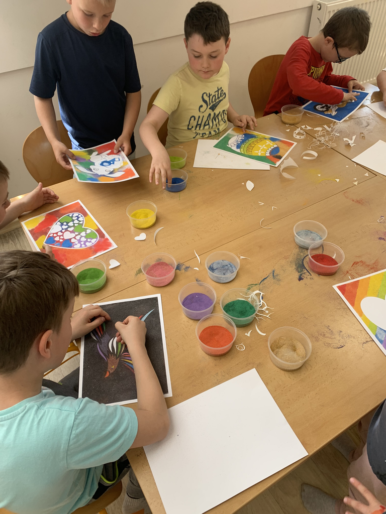 Ve dnech 14. a 15. dubna jsme v družinách zažili opravdu krásné tvoření. Děti měly možnost si vytvořit obrázky pomocí barevných písků. Mohly si vybrat z různých motivů, mezi které patřily zejména ty velikonoční, ale velký zájem děti projevily i o dopravní prostředky, zvířata a květinové vzory. Vznikly tak zajímavé obrázky plné barev a třpytek.