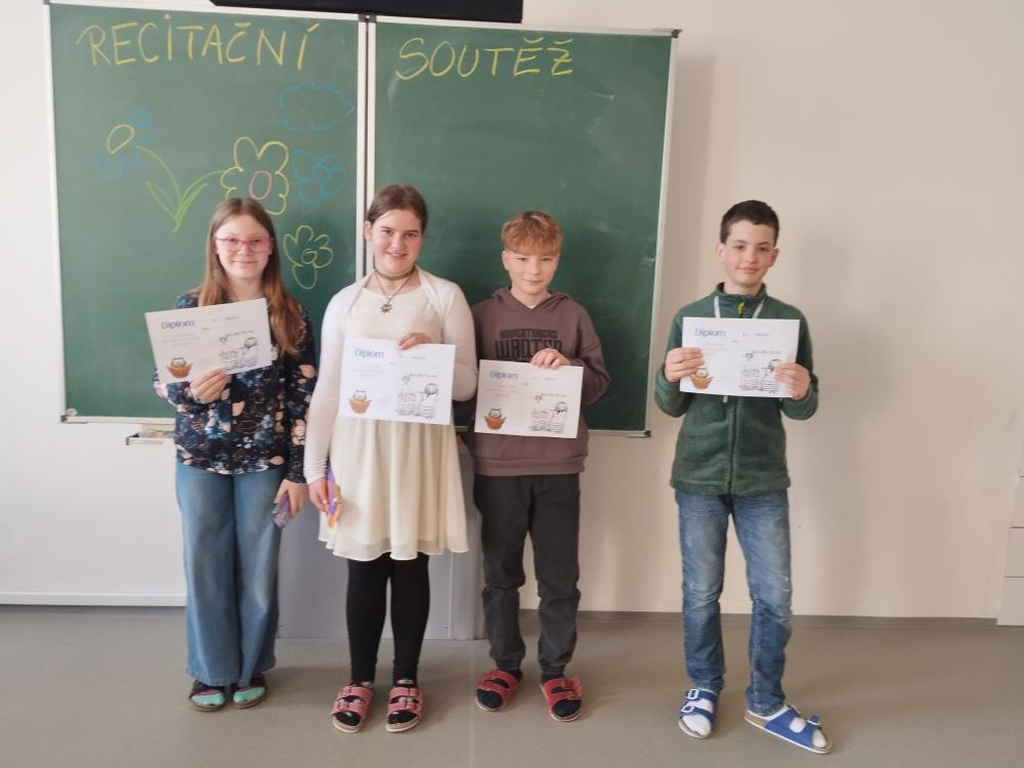 V pátek 20. března 2026 se konalo školní kolo tradiční recitační soutěže pro žáky II. stupně. Všichni účastníci soutěže si dobře zvolili své básně a recitovali je s velkým zaujetím. Porota složená z vyučujících českého jazyka i diváci si mohli vyslechnout ukázky poezie Jiřího Žáčka, Jaroslava Seiferta, K. H. Máchy, Miloše Kratochvíla nebo balad z Erbenovy Kytice a další. Mezi poezií se objevil i přednes prozaické ukázky v podání Kateřiny Stenchlákové, který porotu mile překvapil, a pozitivně překvapila i interpretace vlastního kvalitního textu Venduly Kurialové. Nakonec po nelehkém rozhodování bylo rozhodnuto, vítězkou první kategorie byla Veronika Kulišťáková z 6.C, druhé místo získal Tomáš Borůvka z 6.A, na třetí pozici se umístila Nela Goricová ze 7.A a bylo uděleno i čtvrté místo Maxmiliánu Bezecnému z 6.A.  Ve II. kategorii žáků 8. a 9. tříd bylo rozhodování také velmi náročné, nakonec byla udělena dvě první místa, Kateřině Stenchlákové z 8.B a Vendule Kurialové z 9.A. Druhé místo získala Tereza Borůvková z 9. B. A na třetím místě skončila Laura Vaverková z 8.C. Všem recitátorům moc děkujeme za reprezentaci třídy a vítězům gratulujeme.
