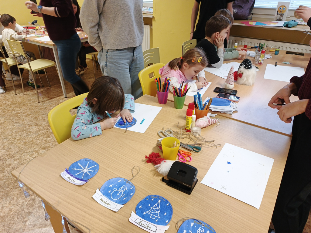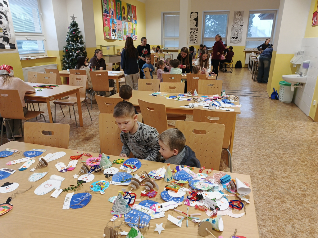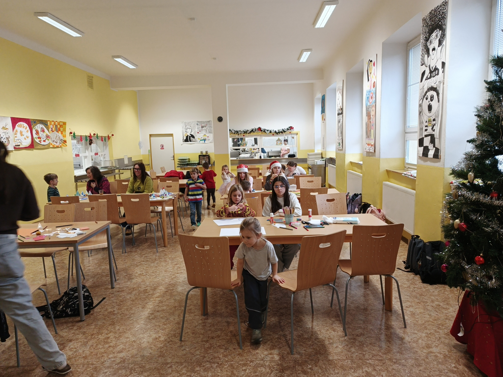 Ve středu 10. 12. 2025 se uskutečnily již tradiční výtvarné dílny, které si chystají žáci II. stupně pro děti z mateřských škol. Tentokrát se akce účastnili žáci napříč ročníky II. stupně od 6. do 9. ročníku. Všichni se na vánoční tvoření pečlivě přichystali a vytvořili materiál pro 50 školkových dětí. Malí návštěvníci si tak mohli v třinácti dílničkách vyrobit papírové ozdoby na stromeček, ozdobit perníček, z lepenkových koleček vytvořit stromeček, zmizíkem namalovat inkoustovou baňku, sestavit a vymalovat vánočního jezevčíka a mnoho jiných výtvorů s vánoční tématikou. Dětem z MŠ se společná práce moc líbila a žáci naší školy se budou těšit na společné tvoření v příštím školním roce.